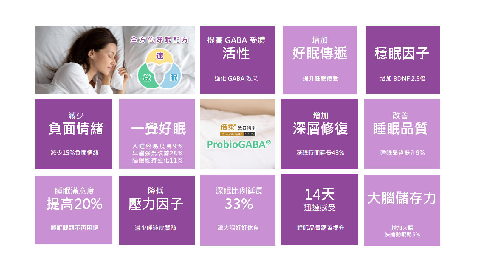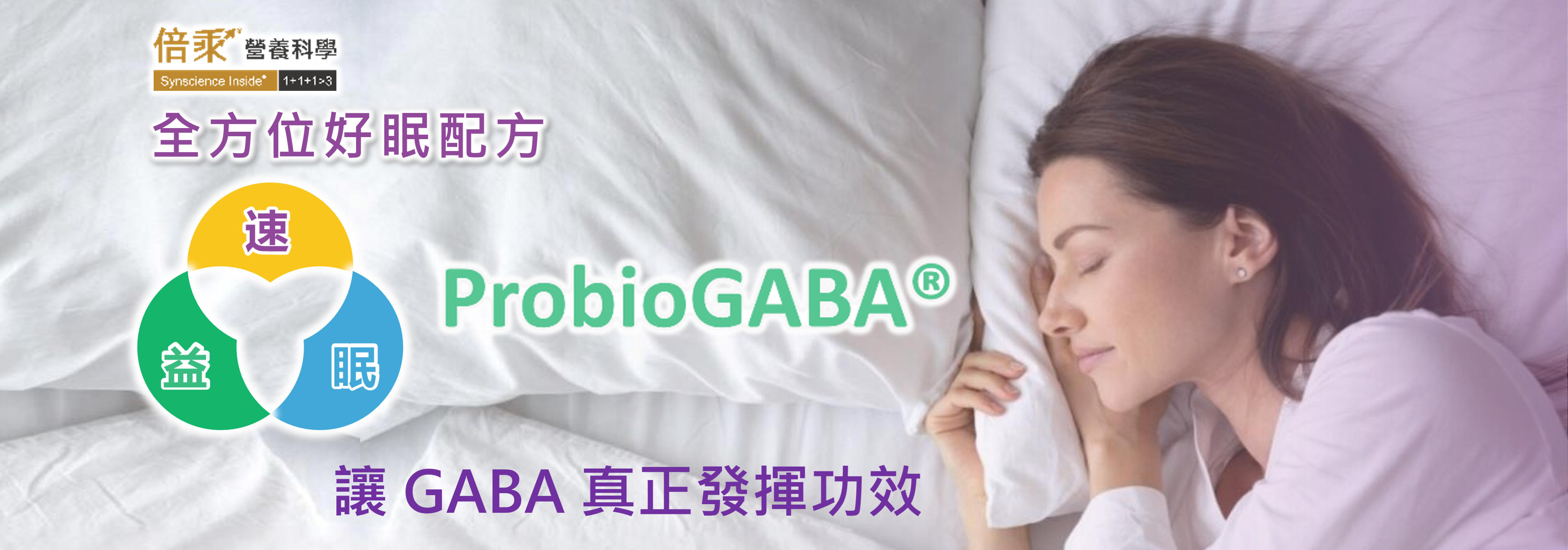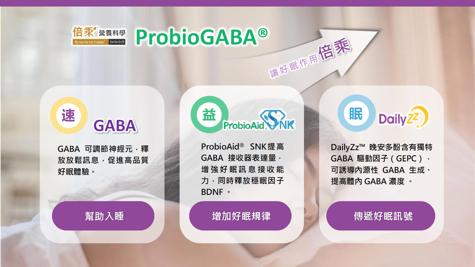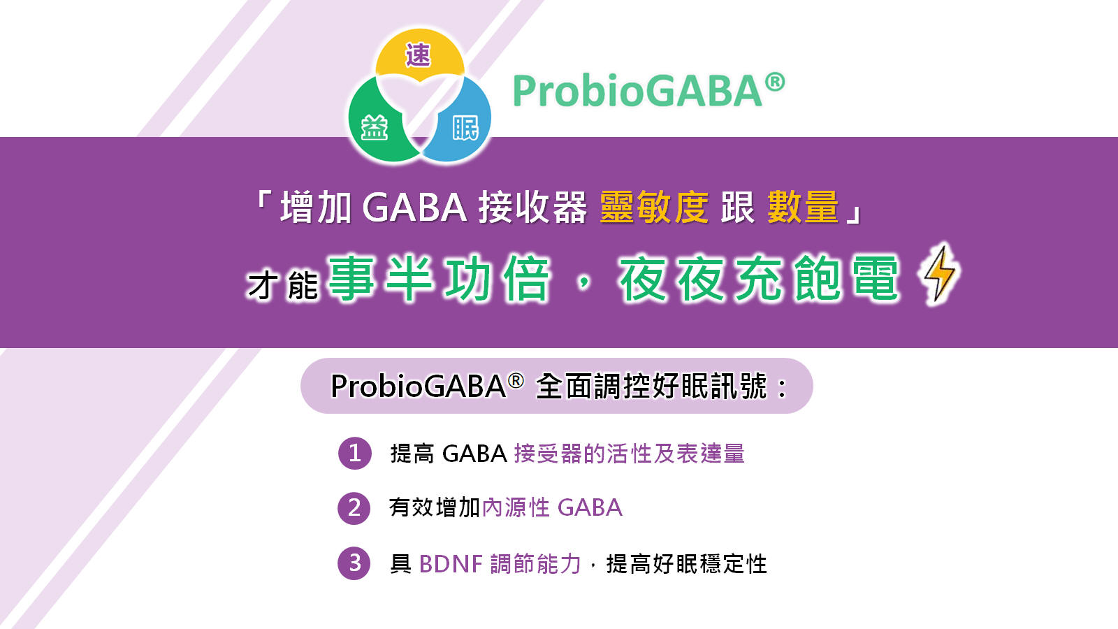 ProbioGABA® 速益眠倍乘配方 GABA 的確可以調節壓力與促進睡眠,但為什麼很多人吃了 GABA 仍無感? 因為 GABA 必須要透過體內 GABA 接受器的幫助,才能進行訊息傳遞,當體內 GABA 接收器的數量太少或活性不夠時,就算補充大量的 GABA 也無法產生作用。